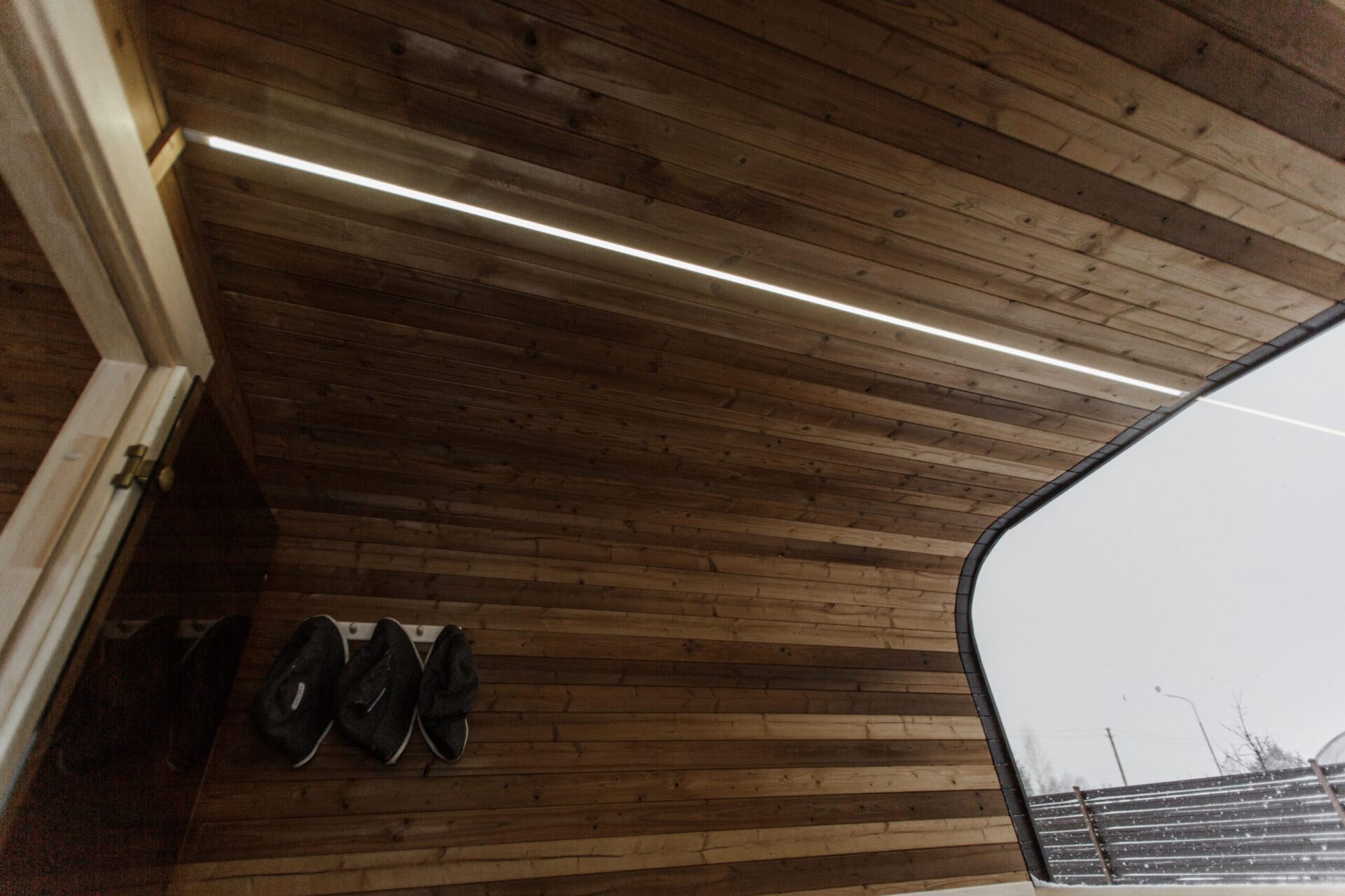 Im Vorraum der Sauna finden Sie zwei praktische Steckdosen, die Ihnen die Möglichkeit bieten, zusätzliche elektrische Geräte zu nutzen. Ausßerdem sorgt eine LED-Beleuchtung für eine angenehme Helligkeit und unterstreicht das moderne Design unserer Sauna.