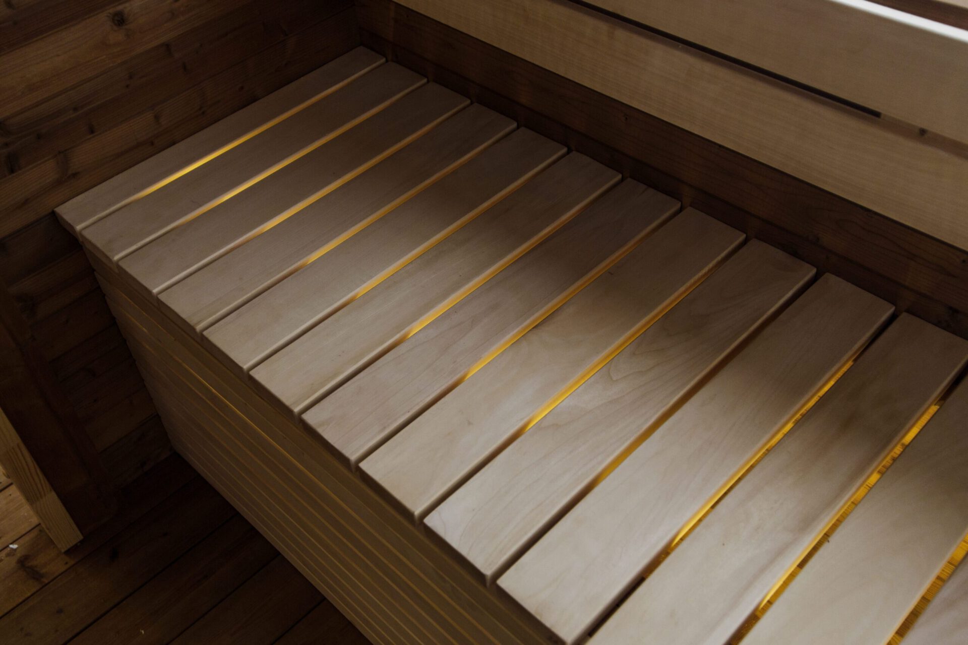 Für eine stimmungsvolle und beruhigende Atmosphäre sorgt die LED-Beleuchtung unter den Bänken in der Sauna. Diese indirekte Beleuchtung schafft eine warme und entspannende Umgebung. Zusätzlich sorgt eine Harvia-Lampe in der Ecke der Sauna für eine gleichmäßige Ausleuchtung.